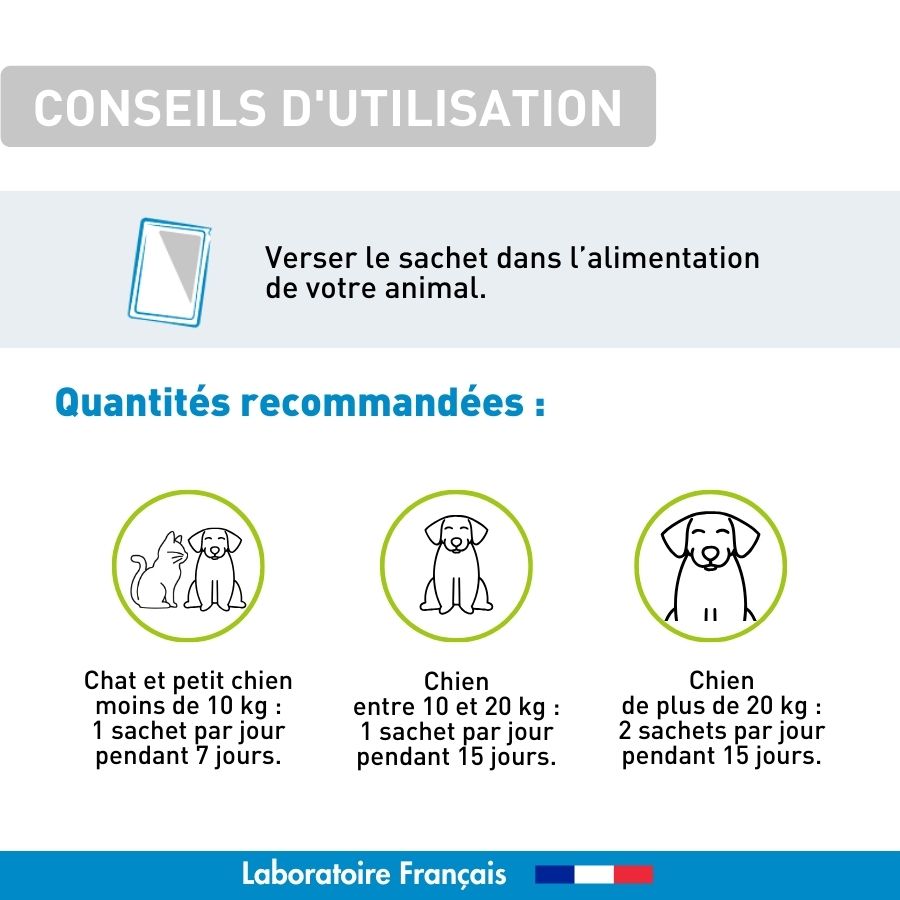 • Chat et petit chien de moins de 10 kg : 1 sachet par jour pendant 7 jours.